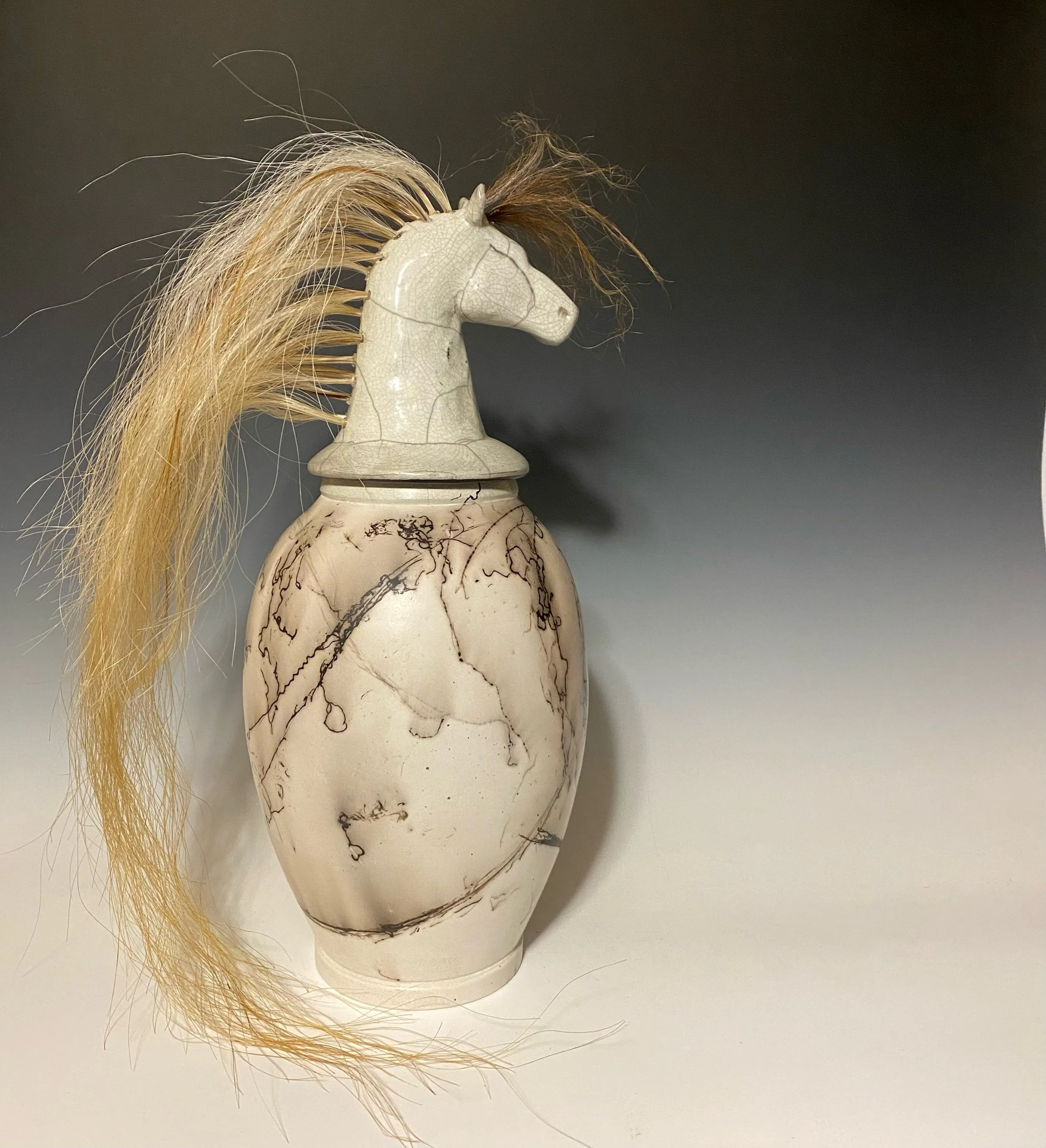 Shauna MacLeod Horse Raku Fired in Reduction, Local Reduction With Horse Hair, Raku Clay, Horse Hair 15” x 6” $580