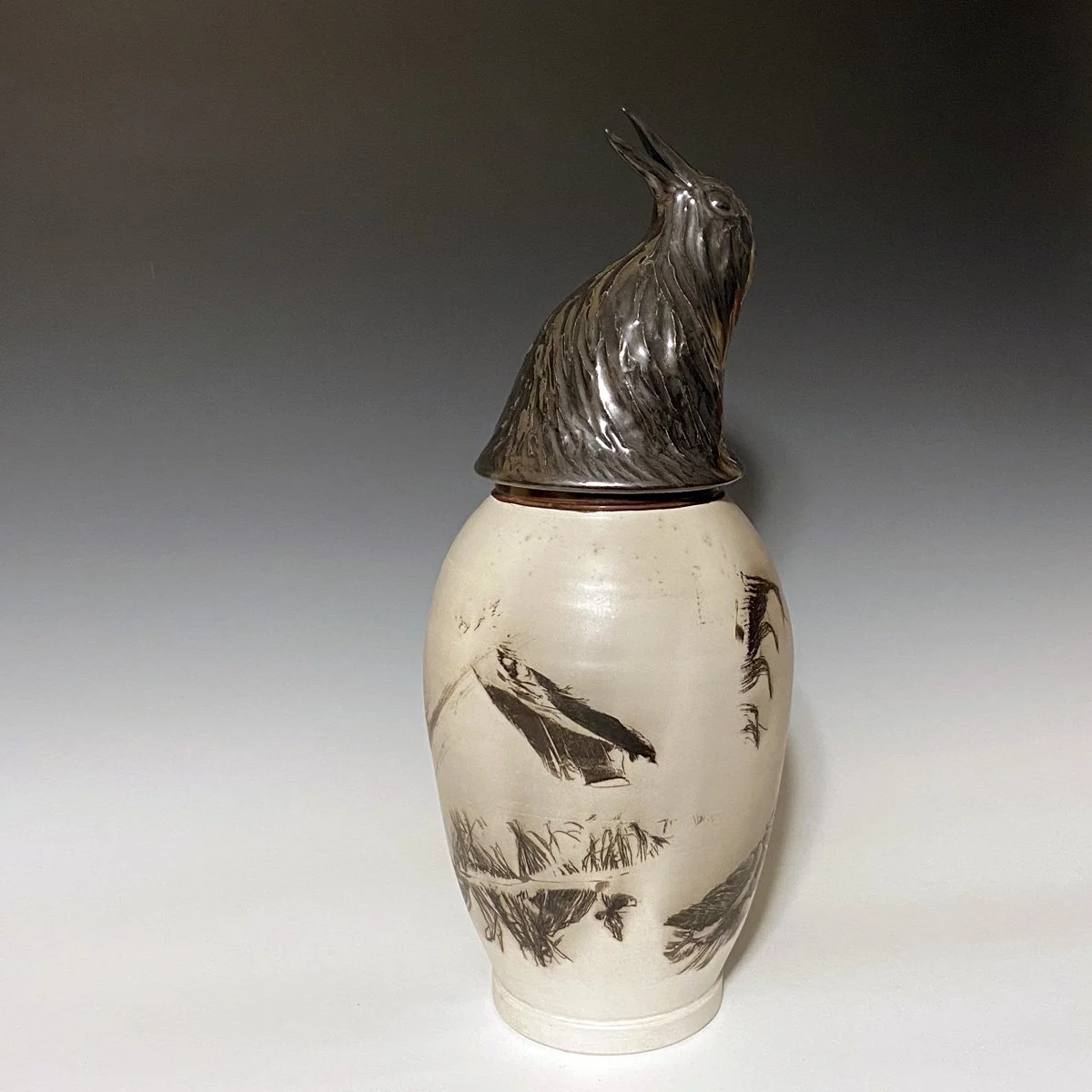 Shauna MacLeod Crow Raku Fired in Reduction, Local Reduction With Crow Feathers, Raku Clay 15.5” x 6” $495